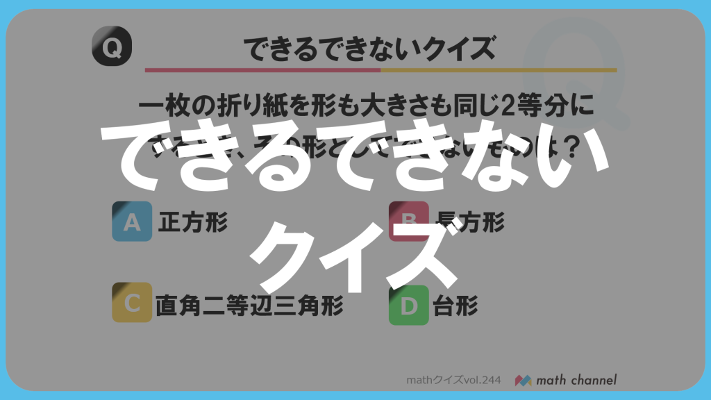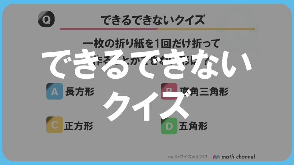 大人も楽しい、算数クイズ! math channelがお届けする「算数クイズ」は毎週水曜日公開!さっそくチャレンジしましょう! Vol.243「できるできないクイズ」 math channelは様々な算数コンテンツをお届け! YouTube、Twitter、LINEなどで様々な情報をお届け... -