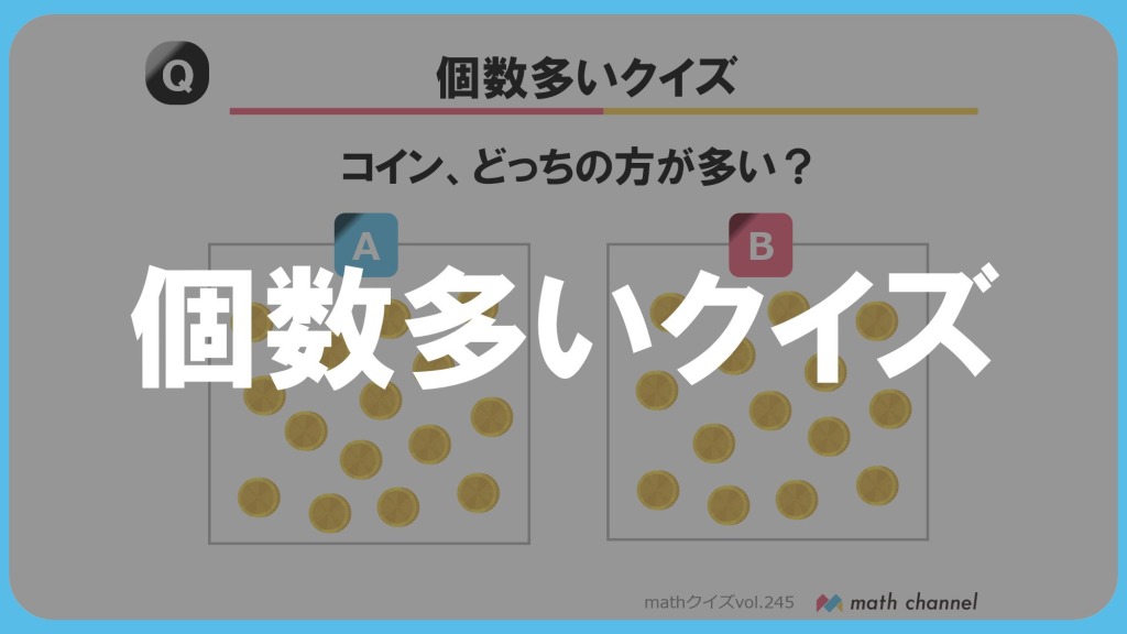 大人も楽しい、算数クイズ! math channelがお届けする「算数クイズ」は毎週水曜日公開!さっそくチャレンジしましょう! Vol.249「個数多いクイズ」 math channelは様々な算数コンテンツをお届け! YouTube、Twitter、LINEなどで様々な情報をお届け中! ※... -