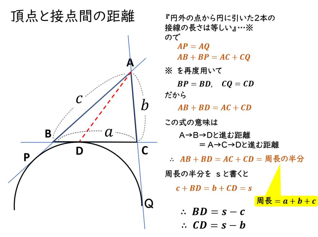 三角形の半周長 s=(a+b+c)/2​ を用いると、頂点と各辺の接点間の距離は以下のように表されます: