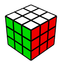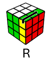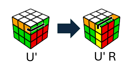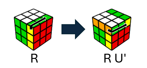 また、下のような状態のキューブは右面を時計周りに90度回した(R)後、上面を反時計周りに90度回した(U’)状態です。