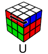 次に、回し方とその表し方について紹介します。上面(白の面)を上から見たときに時計周りに回す操作をUと表記します。