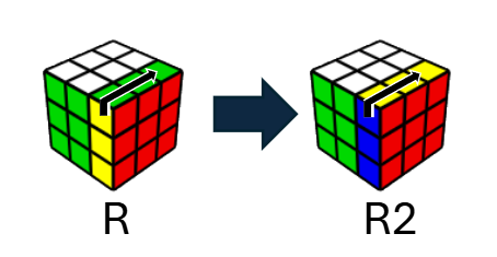 例えば、右面を180度回す操作はRを2回行うため下のように表します。
