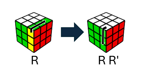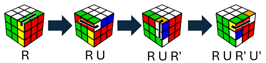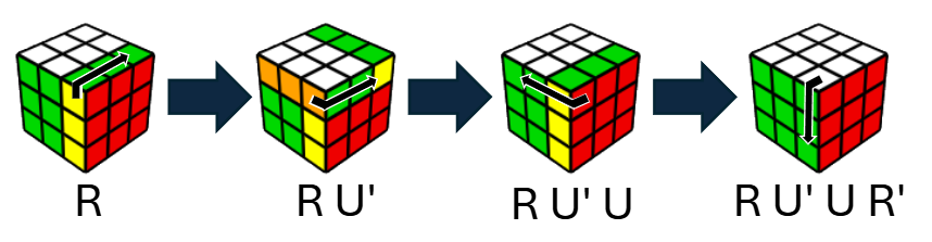 これは直感的に分かりやすいのですが、下に示すR U R’ U’という操作を何回か繰り返してみてください。