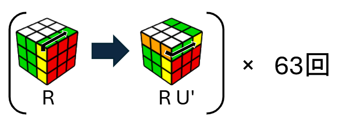 続いて、先ほど出てきたR U’という動きを繰り返してみましょう。これは少し難しいのですが63回繰り返すと元に戻ります。
