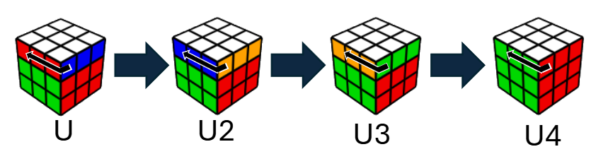 例えば、上面を時計周りに90度回した(U)という操作は4回行うと元の完成状態に戻ります(U U U U = U4 = E )。
