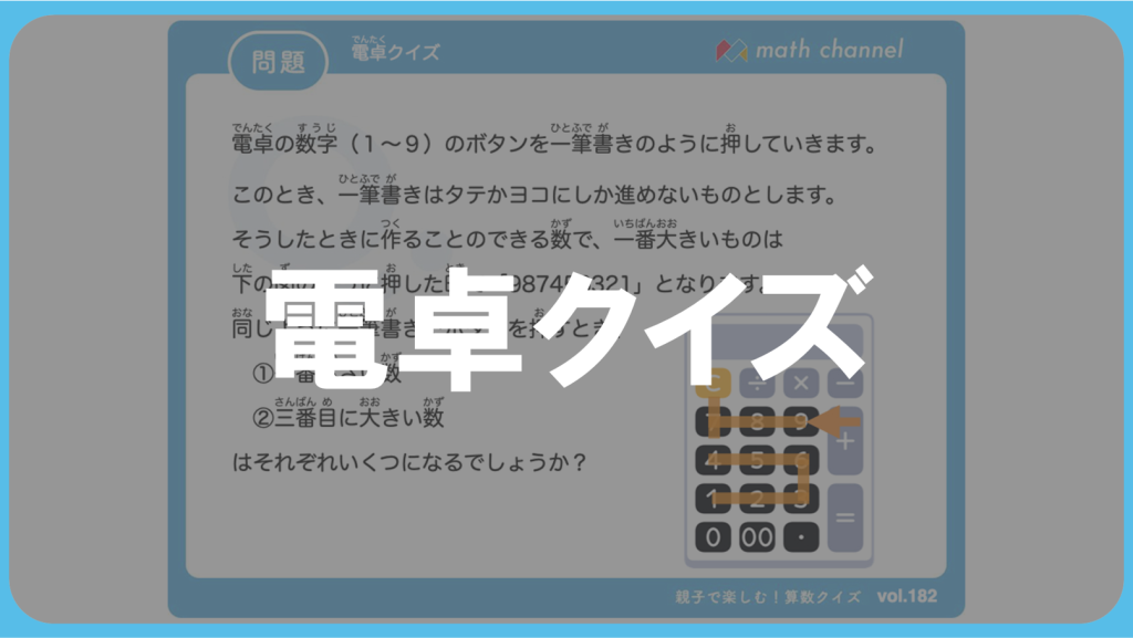 【親子で解ける!大人も楽しい、算数クイズ!】 math channelのメンバーたちで考えた「算数クイズ」を毎週公開します! 今回は「電卓クイズ」にという問題を出題します♪この問題では「電卓」で一筆書きのように数字を入力していき、できる数字を考えていき... -