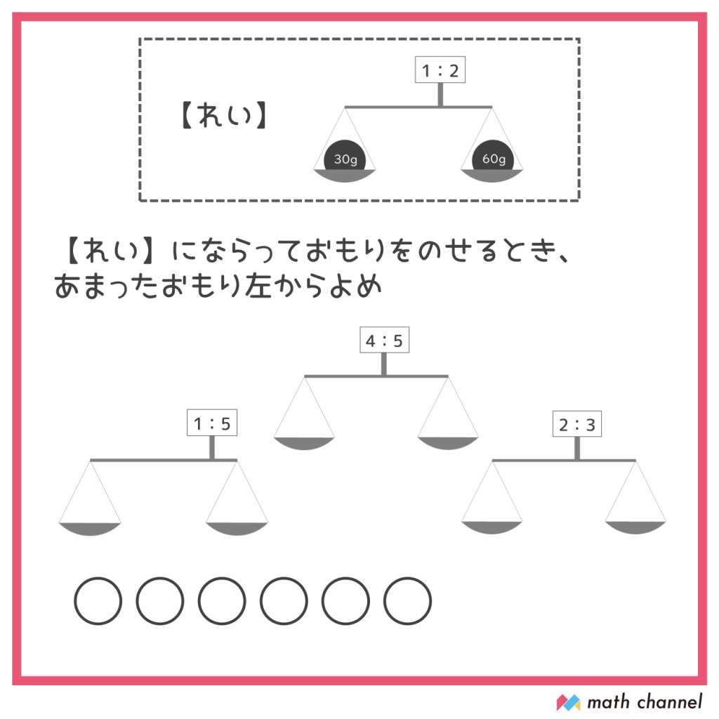 おもりをのせるてんびんをかいて、それぞれ「比」を設定します。