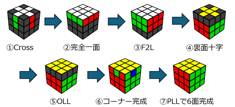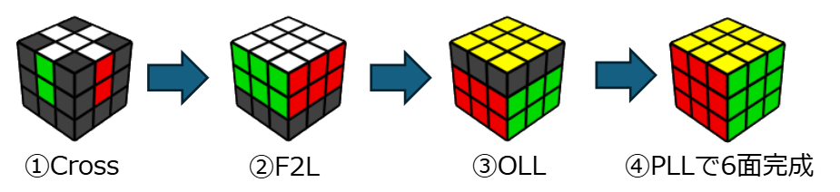 また、CFOP法はCross→First 2 Layer(F2L)→Orientation of the Last Layer(OLL)→Permutation of the Last Layer(PLL)の順番で解く方法で、簡易CFOP法はCross以外を2stepに分けることで覚えなければいけない操作をOLL57種類とPLL21種類をOLL2~5種類とPLL2~5種類までに減らしているという違いをより深く理解するようにしました。