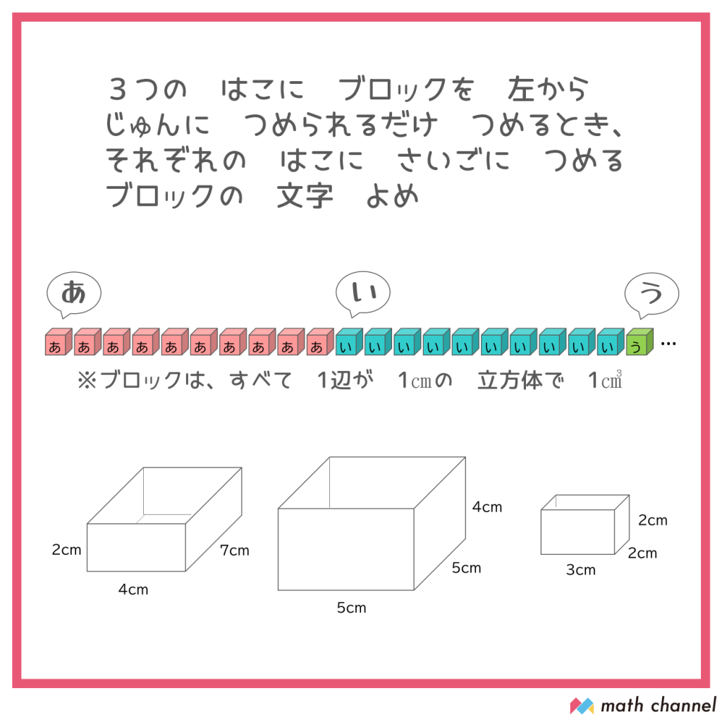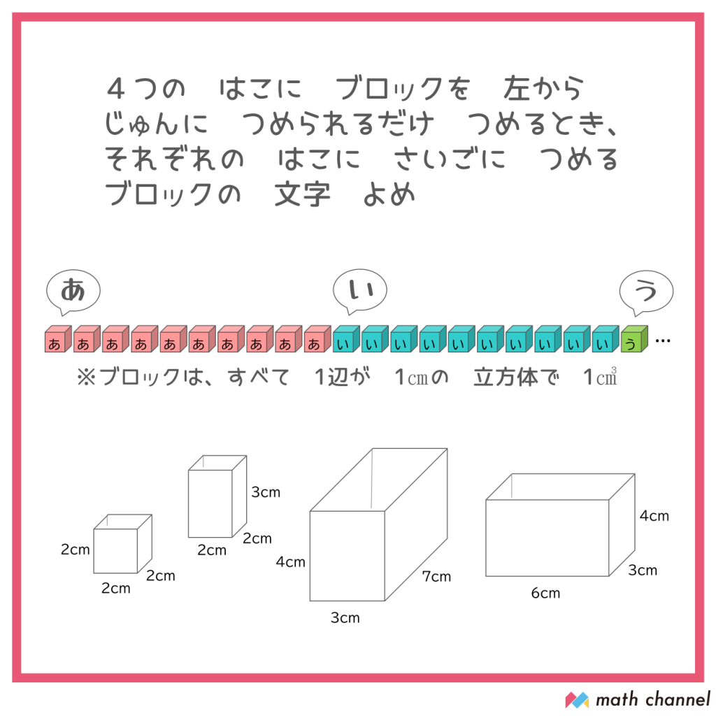 最後につめるブロックを「た」にするためには、真ん中の箱を何㎤にしたらいいのでしょうか?