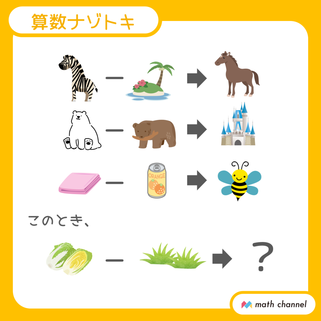 【2】イラストでひき算する問題です。ひき算ということは、左から右を取り除くと考えることができますよね。「しまうま」から「うま」をのぞいて「しま」、「しろくま」から「くま」をのぞいて「しろ」、「はんかち」から「かん」をのぞいて「はち」だったわけです。つまり答えは「はくさい」から「くさ」をのぞいた「はい」となります。