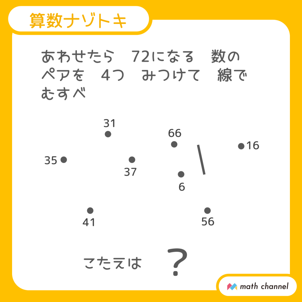 【3】31と41、35と37、66と6、16と56の組み合わせが、それぞれあわせると72になります。ペア同士を結ぶと「ナツ」という字が浮かび上がります。「72」という数が設定されている理由に気が付きましたか?(笑)
