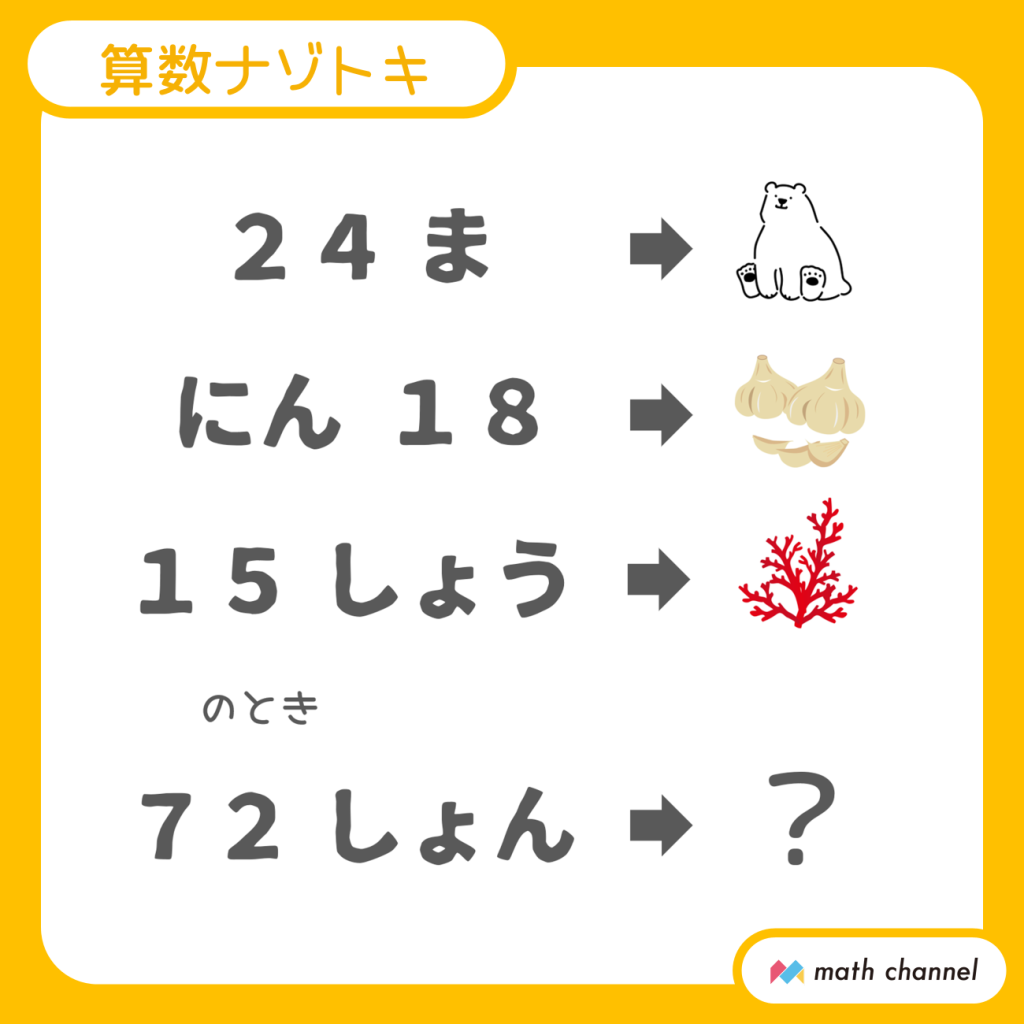 【4】「24ま→しろくま」ということは、「24→しろく」ですね。同様に「18→にく」「15→さんご」と考えると、どれも九九とその答えの関係になっていることがわかります。したがって、「72」の部分には答えが72になる九九で、うまくあてはまる「はっく」が入ります。