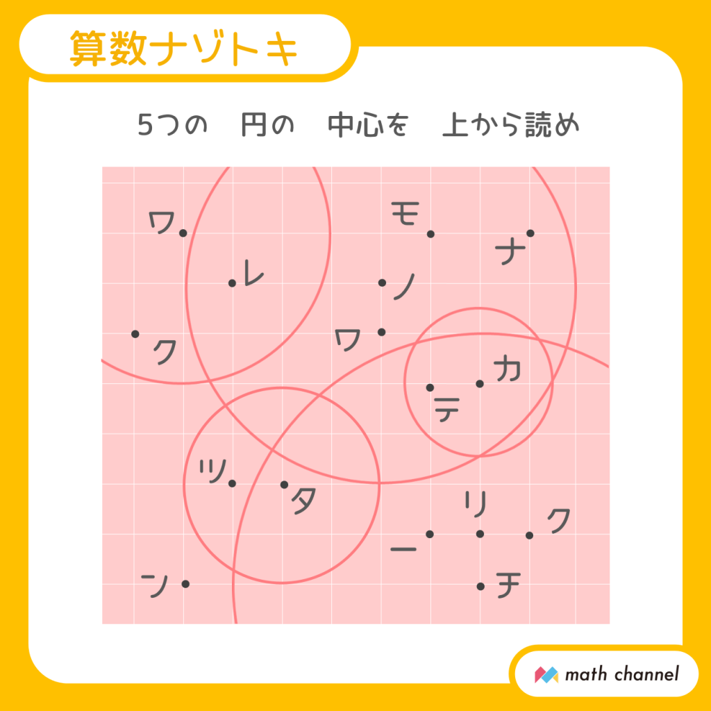 【5】マス目を利用してよくみてみましょう。円の中心にあたるのはそれぞれ「ワ」「ノ」「カ」「タ」「チ」の点です。