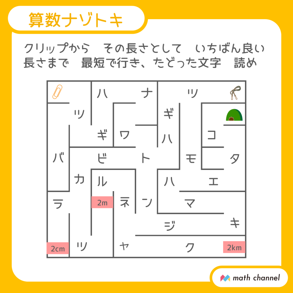 【6】クリップの長さとして妥当なのは「2㎝」なので、「クリップ」から「2㎝」まで迷路をたどると、「ツギハナワトビカラ(次は縄跳びから)」となります。そこで「縄跳び」から「2m」までたどると「ツギハトンネル(次はトンネル)」、と指示が現れるので最後に「トンネル」から「2km」まですすみましょう。「コタエハマキジャク(答えは巻き尺)」となります。