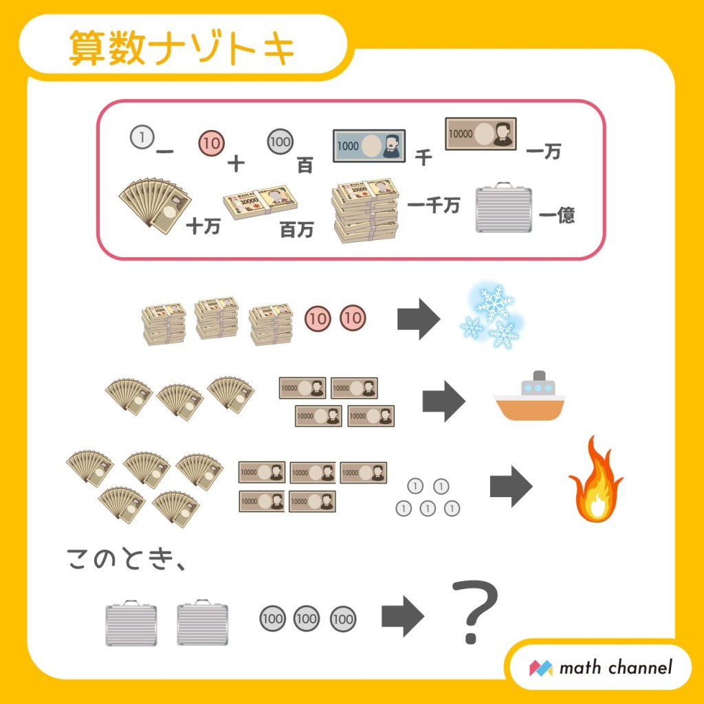 【7】イラストはそれぞれ「ゆき」「ふね」「ほのお」を表しています。お金の種類と文字数が同じなので、十万の束3つが「ふ」、十万の束5つが「ほ」を示しているとわかります。どちらもハ行の文字なので、お金の種類が「あかさたな~」の行、その数が何段目の文字かを表していることが推測できます。答えはラ行の2段目の文字とサ行の3段目の文字なので、リスです。