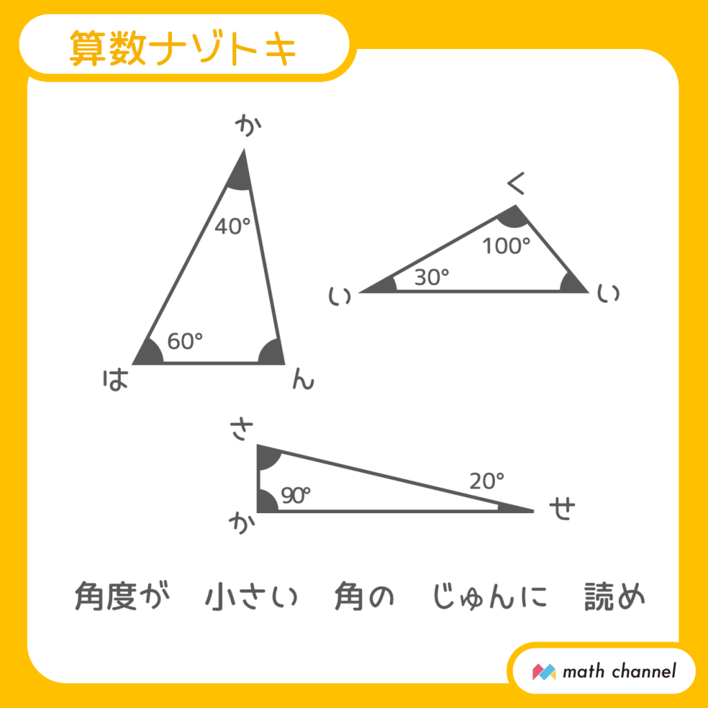 【8】三角形の3つの角度をあわせると180°になるので、「い」の角=50°、「ん」の角=80°、「さ」の角=70°とわかります。小さい順に読むと「せいかいはさんかく」となります。