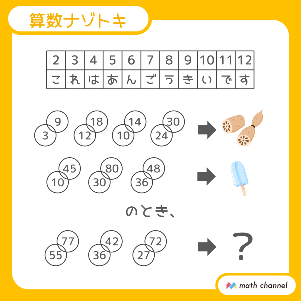 【9】イラストはそれぞれ「レンコン」「アイス」を表しています。2つの輪のセットの数と文字数が同じなので、「3と9」で「レ」、「12と18」で「ン」、「10と14」で「コ」、「24と30」で「ン」を示しているとわかります。上の対応表では「レ」は「3」、「ン」は「6」、「コ」は「2」となっているので、「3と9」が「3」、「12と18」または「24と30」が「6」、「10と14」が「2」になると考えられます。これは、2つの数の最大公約数ですね。