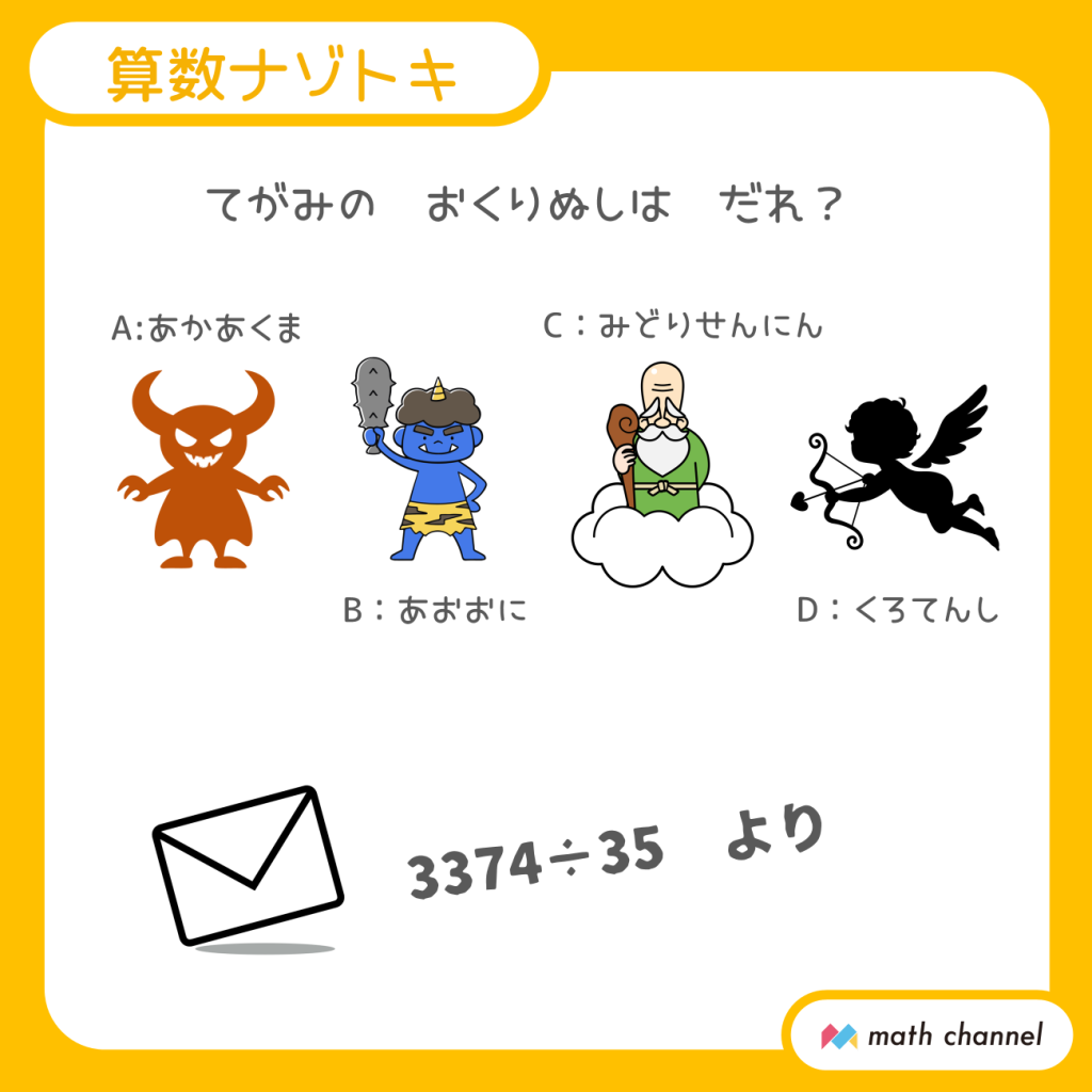 【10】素直に差出人らしい「3375÷35」を計算してみましょう。答えは「96.4」。ということは、手紙を出したのは9(く)6(ろ).(てん)4(し)です。