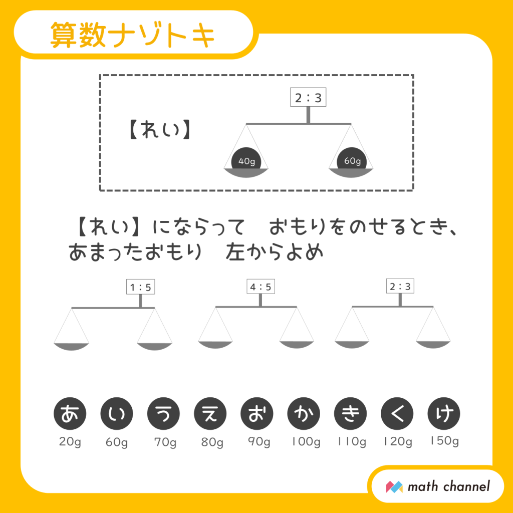 【11】天秤の上に書かれている比となるよう、おもりをのせると考えると、左の天秤には20gと100g、真ん中の天秤には120gと150g、右の天秤には60gと90gのおもりを使います。したがって、あまったおもりは70gの「う」80gの「え」110gの「き」