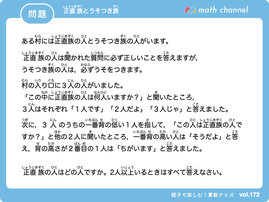 算数クイズに挑戦!vol.172「正直族とうそつき族」にチャレンジ!